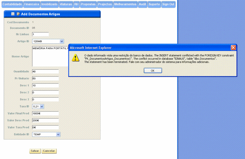 I already checked the relatioship and i got the document '05' in the Documentos table but it stills returns me the error in the pic above