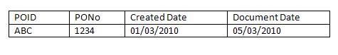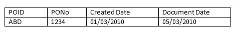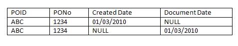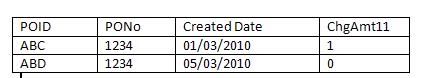 | Hi, If I follow the select statement that you suggested, the result will as the following:PONumber Createddt DocumentDate1234 NULL 01/03/2010 (ChgAmt11=1)1234 05/03/2010 NULL (ChgAmt11=0)This is not the result I expected. My expected result is:PONumber Createddt DocumentDate1234 05/03/2010 01/03/2010 |